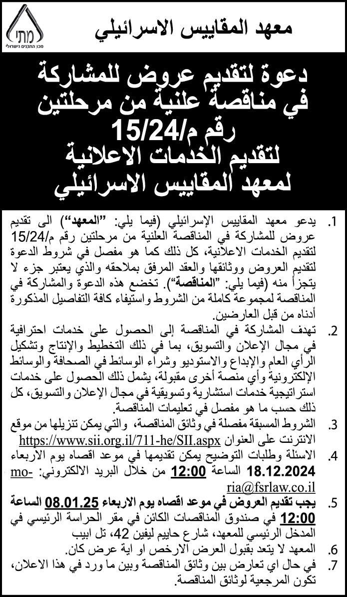 מכרז פומבי דו-שלבי מס' מ/15/24 למתן שירותי פרסום עבור מכון התקנים הישראלי